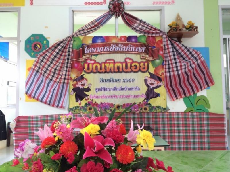 นายสฤษดิ์ บัวลง นายกองค์การบริหารส่วนตำบลท่าค้อ มอบหมายให้ นายคำนึง ลับจันทร์ รองนายกองค์การบริหารส่วนตำบลท่าค้อ และนางสาวญาณ์ณิศา พรหมวิศาสตร์ ผู้อำนวยการกองการศึกษา ศาสนาและวัฒนธรรม เป็นประธานในพิธีมอบใบประกาศนียบัตรแก่นักเรียนที่สำเร็จการศึกษาของสถานศึกษาในสังกัดองค์การบริหารส่วนตำบลท่าค้อ ประจำปีการศึกษา 2560 ทั้ง 4 แห่ง คือ ศูนย์พัฒนาเด็กเล็กบ้านท่าค้อ ศูนย์พัฒนาเด็กเล็กบ้านนาหลวง ศูนย์พัฒนาเด็กเล็กวัดศรีจันทราวาส และศูนย์พัฒนาเด็กเล็กวัดอัมพวนาราม โดยมีนักเรียนและผู้ปกครองเข้าร่วมกิจกรรมเป็นจำนวนมาก