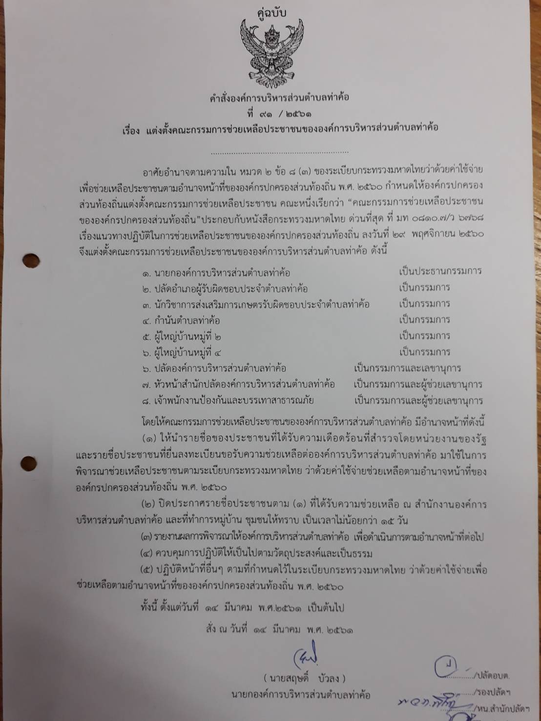คำสั่งองค์การบริหารส่วนตำบลท่อค้อ เรื่อง คณะกรรมการในการช่วยเหลือประชาชน