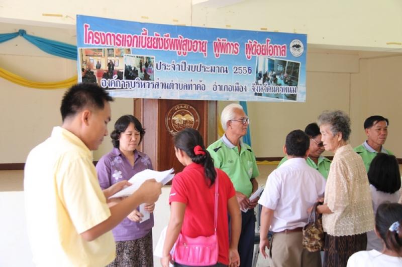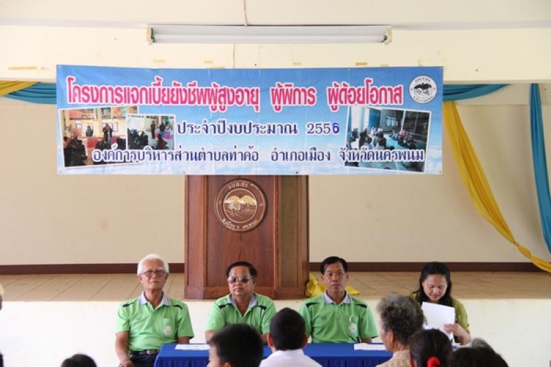 รายละเอียด : คณะผู้บริหารองค์การบริหารส่วนตำบลท่าค้อ มอบเงินสงเคราะห์ช่วยเหลือผู้ด้อยโอกาส งวดที่ 1 /2556 จำนวน 37 ราย ๆละ 2,000 บาท ณ อาคารศรีบังกอ องค์การบริหารส่วนตำบลท่าค้อ อำเภอเมือง จังหวัดนครพนม