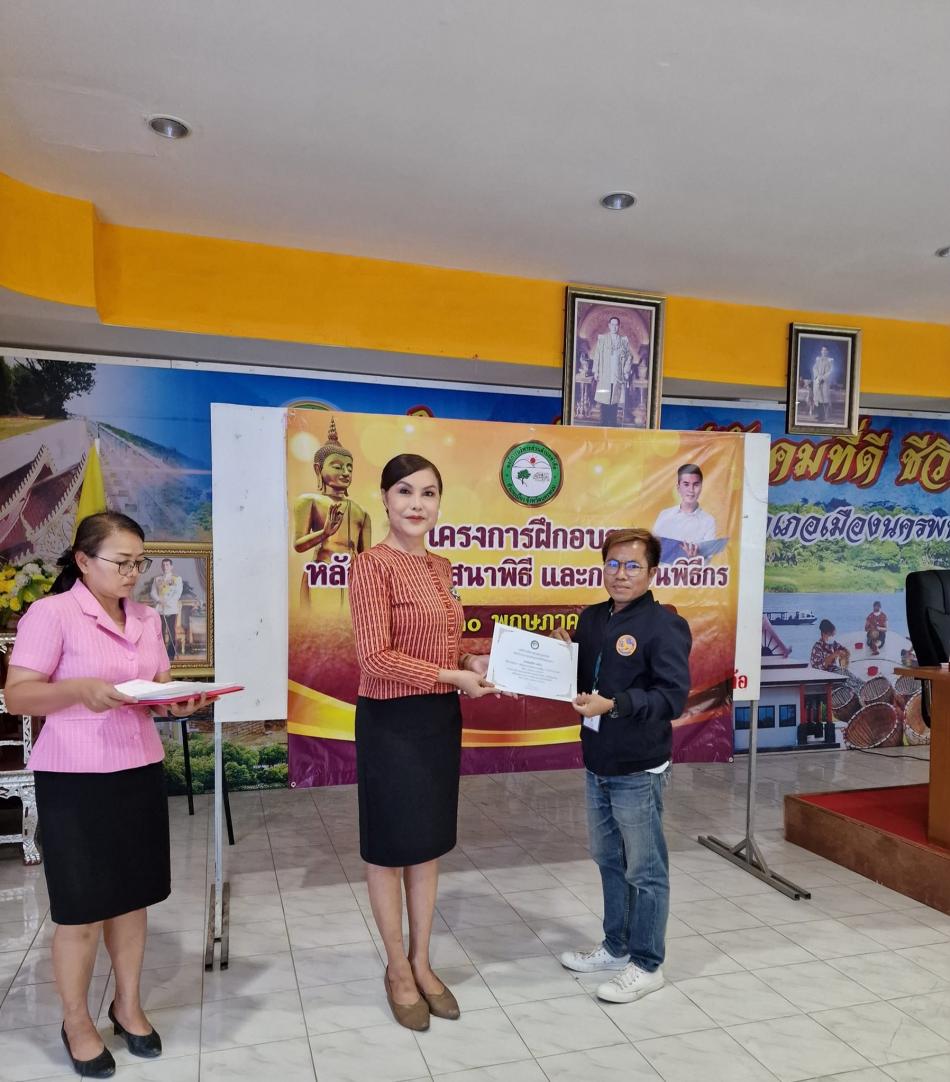 วันที่ 30 พ.ค. 2566 เวลา 08.30 น. คุณพิชญา โพชราษฎร นายก อบต.ท่าค้อ มอบใบเกียรติบัตรให้กับผู้เข้ารับการอบรมตามโครงการฝึกอบรมหลักสูตรศาสนาพิธีและการเป็นพิธีกร ณ ห้องประชุมอาคารศรีบังกอ อบต.ท่าค้อ [30 พฤษภาคม 2566]