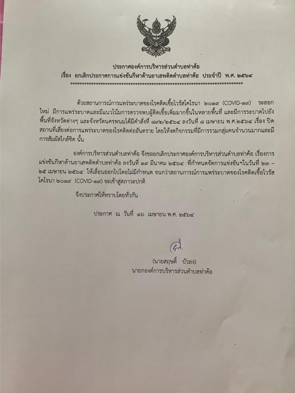 ประชาสัมพันธ์เลื่อนการแข่งขันกีฬาต้านยาเสพติด ประจำปี พ.ศ.2564 [16 เมษายน 2564]