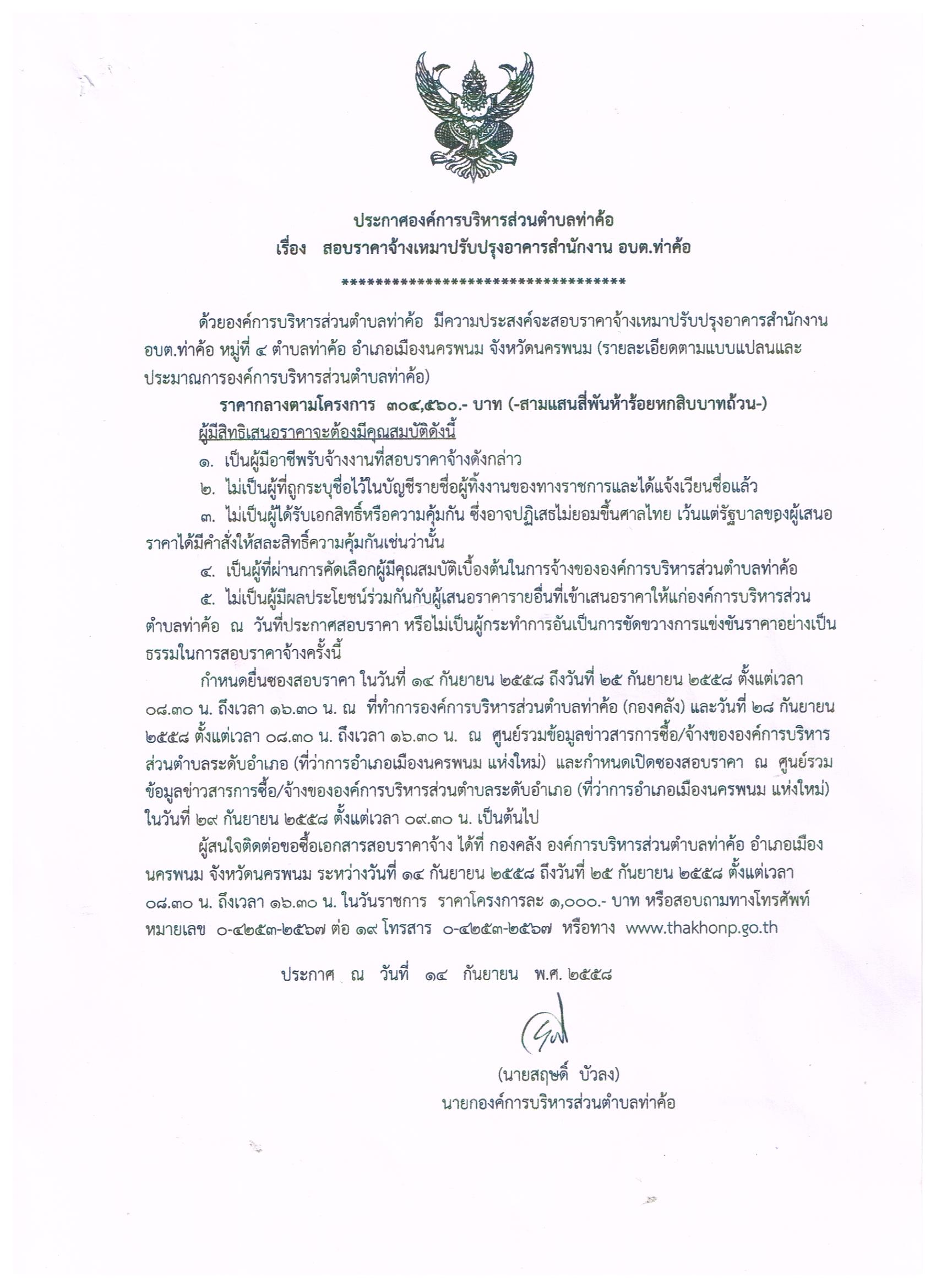 ประกาศ อบต.ท่าค้อ เรื่อง สอบราคาจ้างเหมาปรับปรุงอาคารสำนักงาน อบต.ท่าค้อ