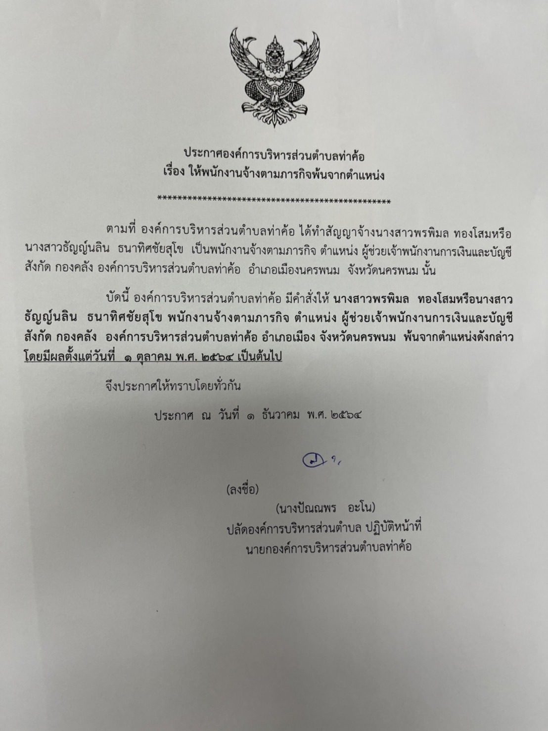 ประกาศองค์การบริหารส่วนตำบลท่าค้อ เรื่อง ให้พนักงานจ้างตามภารกิจพ้นจากตำแหน่ง