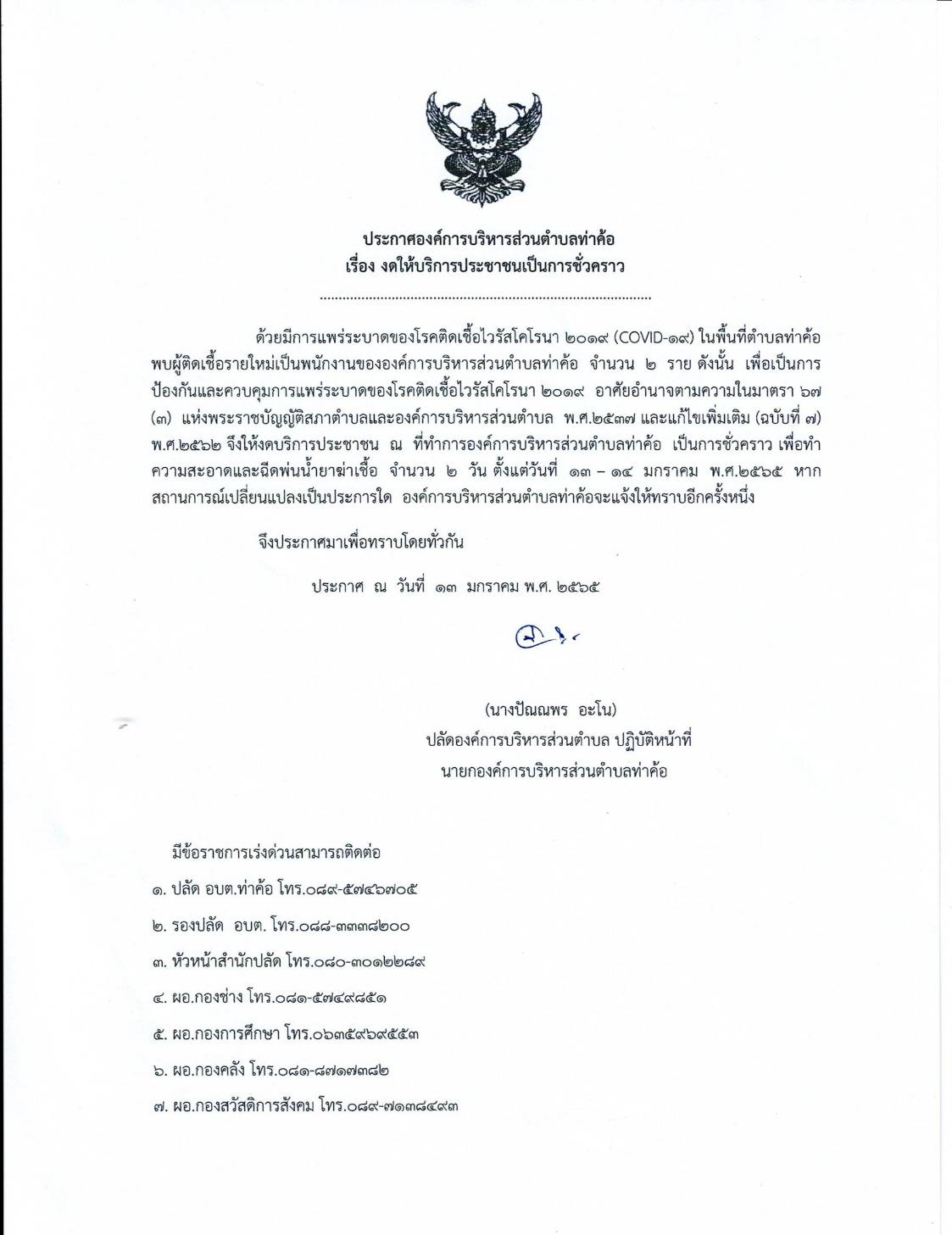 ประกาศองค์การบริหารส่วนตำบลท่าค้อ เรื่อง งดให้บริการประชาชนเป็นการชั่วคราว
