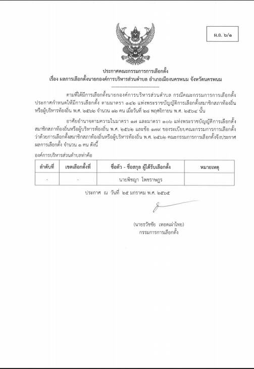 ชื่อเรื่อง : ประกาศคณะกรรมการการเลือกตั้ง เรื่อง ผลการเลือกตั้งนายกองค์การบริหารส่วนตำบล อำเภอเมือง จังหวัดนครพนม