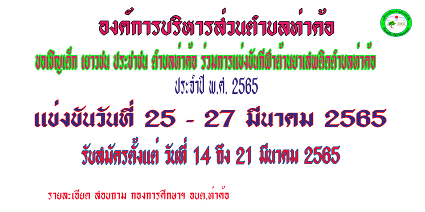 องค์การบริหารส่วนตำบลท่าค้อ ขอเชิญเด็ก เยาวชน ประชาชน ตำบลท่าค้อ ร่วมการแข่งขันกีฬาต้านยาเสพติดตำบลท่าค้อ ประจำปี พ.ศ. 2565