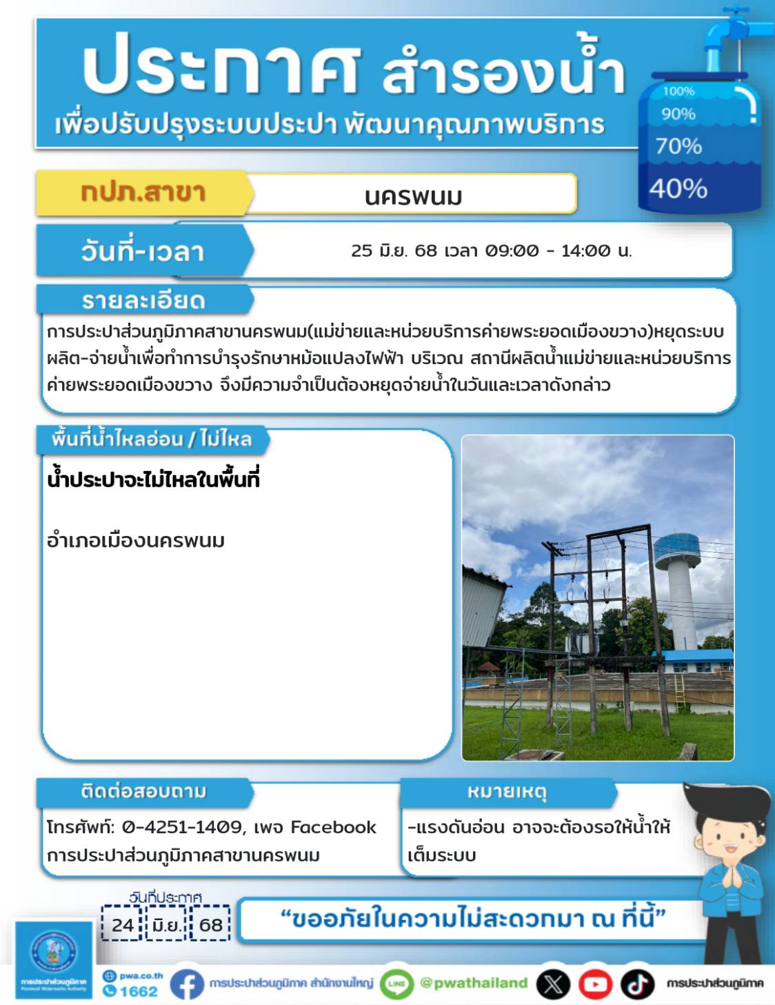 ชื่อเรื่อง : แจ้งประชาสัมพันธ์ ประกาศสำรองน้ำ เนื่องจากบำรุงรักษาหม้อแปลงไฟฟ้า บริเวณสถานีผลิตน้ำแม่ข่ายนครพนม ในวันพุุธ ที่ 25 มิถุนายน 2568 เวลา 09.00 - 14.00 น. พื้นที่ที่ได้รับผลกระทบ : ทั่วทั้งอำเภอเมืองนครพนม จังหวัดนครพนม ติดต่อสอบถามเพิ่มได้ที่ กปภ.สาขานครพนม โทร.042-511409